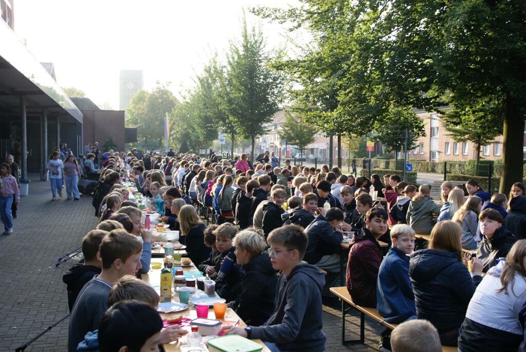 In den Klassen und Oberstufenkursen wurden alle weiteren Zutaten für das Frühstück organisiert. Von der fünften Klasse bis zur Q1, einschließlich Eltern, Lehrkräften und pädagogischen Mitarbeiter:innen, nahmen alle an den aufgebauten Tischen und Bänken Platz, um gemeinsam mit einem reichhaltigen und abwechslungsreichen Frühstück in den Tag zu starten.